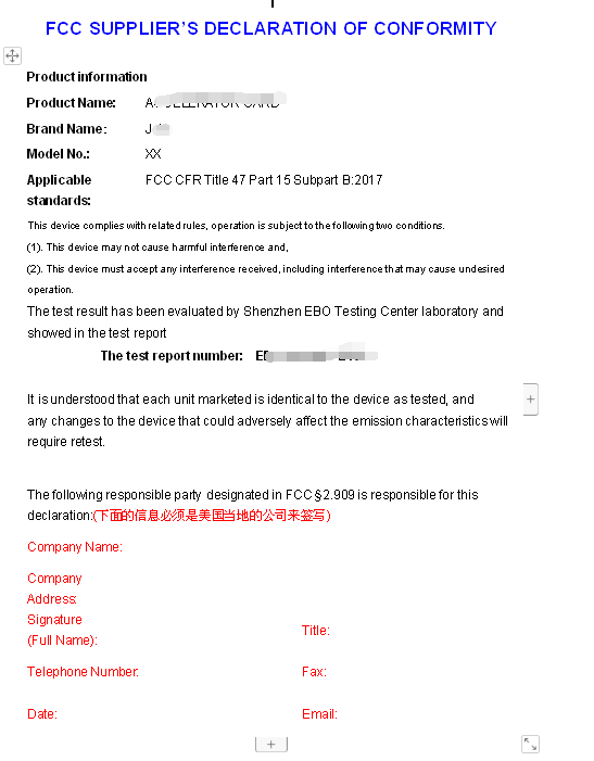 之前產(chǎn)品辦理FCC VOC或者是FCC DOC認證的時候,都是測試報告+證書的。而更新到FCC SDOC之后,不再有證書,而是測試報告+FCC SDOC聲明文件。FCC SDOC聲明文件樣件如下:
